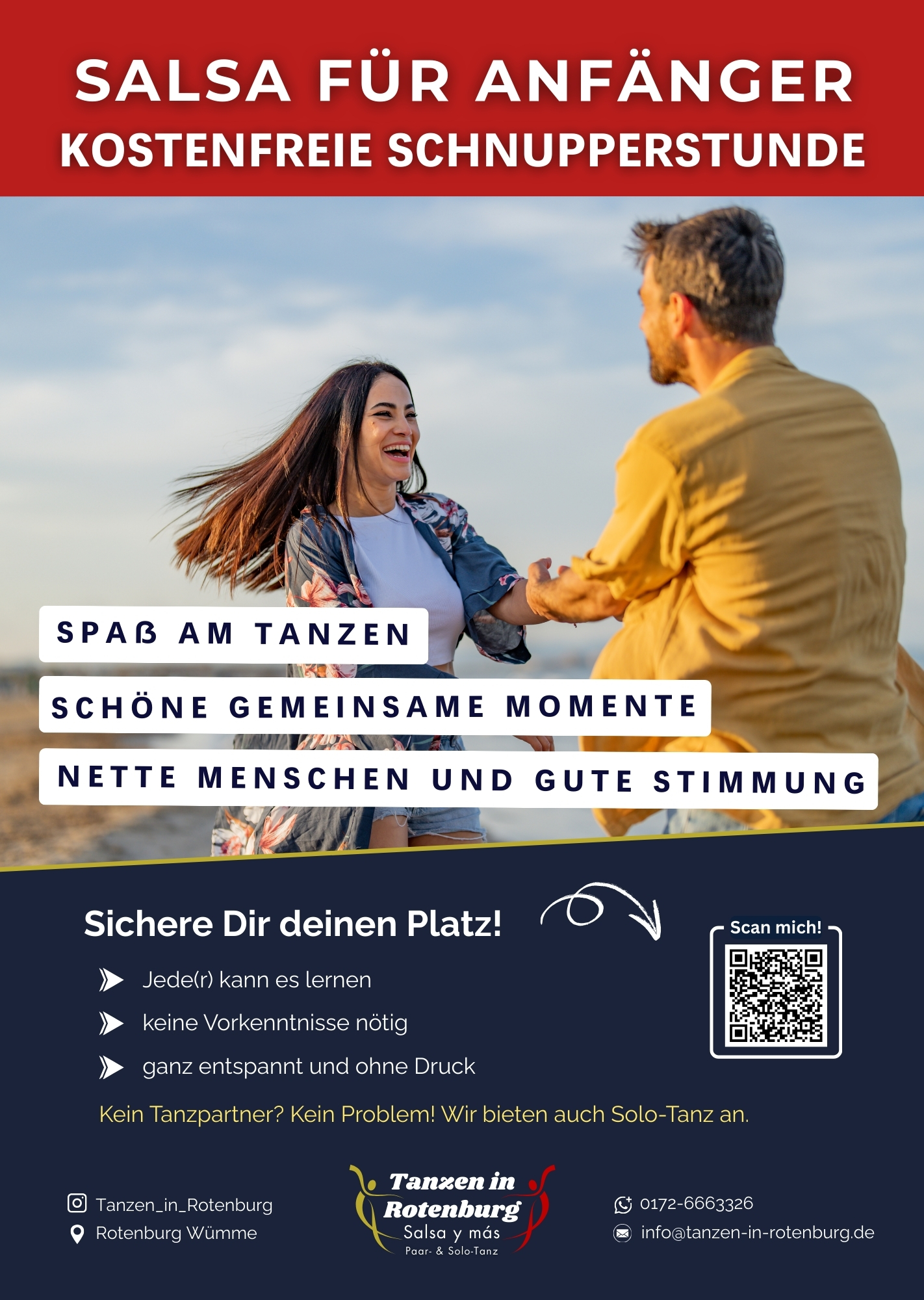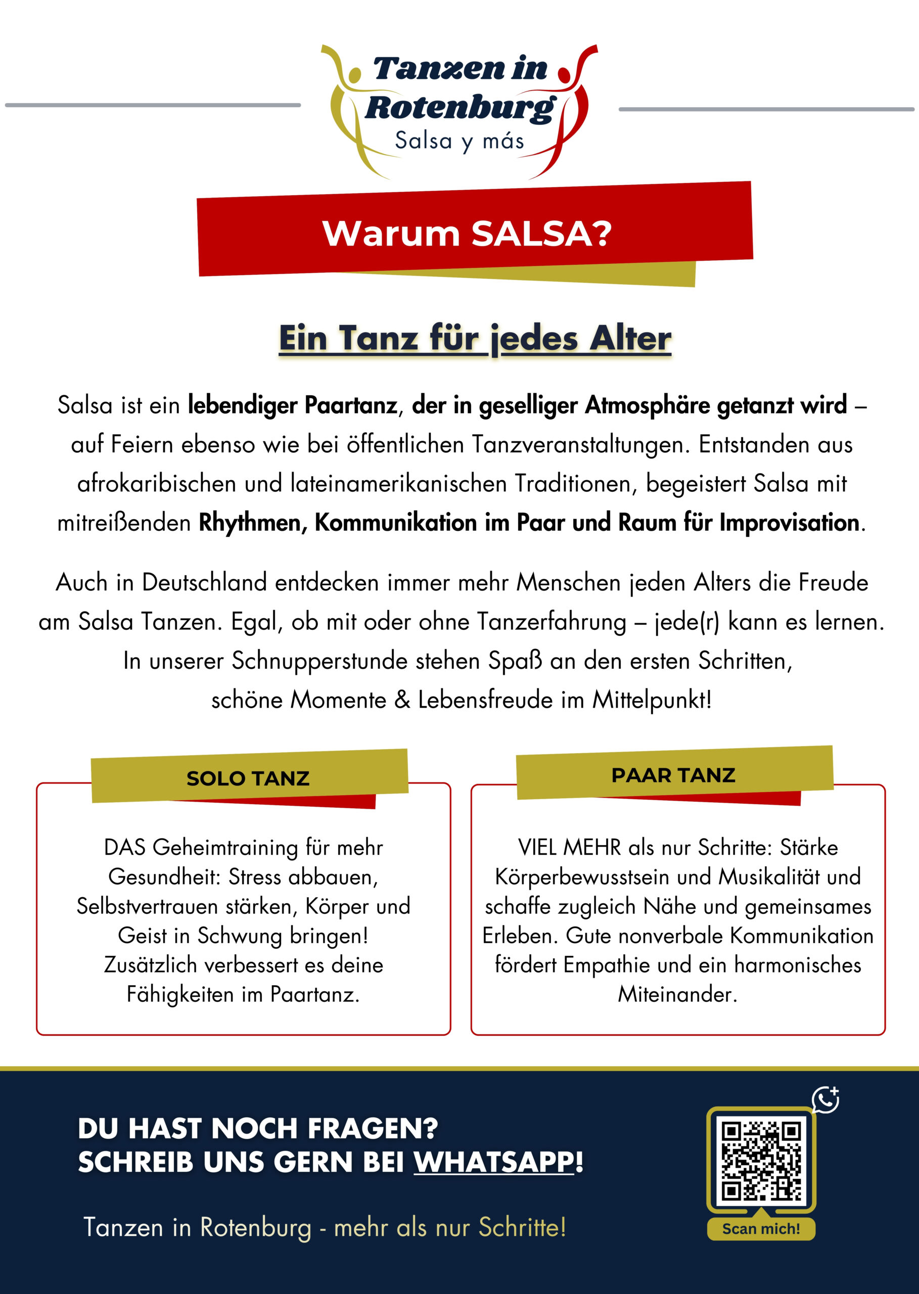Salsa ist ein lebendiger Paartanz, der in geselliger Atmosphäre getanzt wird – auf Feiern ebenso wie bei öffentlichen Tanzveranstaltungen. Entstanden aus afrokaribischen und lateinamerikanischen Traditionen, begeistert Salsa mit mitreißenden Rhythmen, Kommunikation im Paar und Raum für Improvisation.